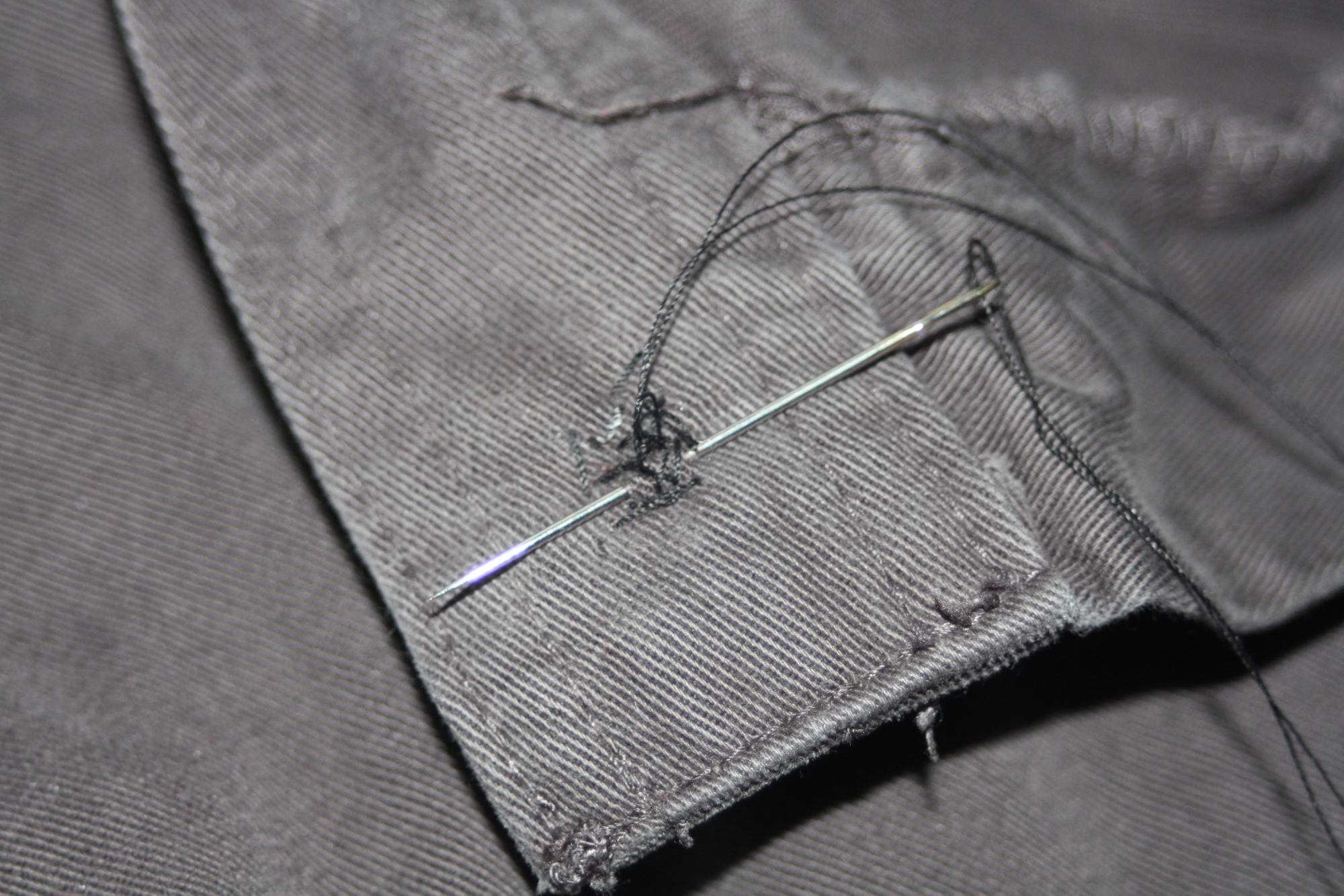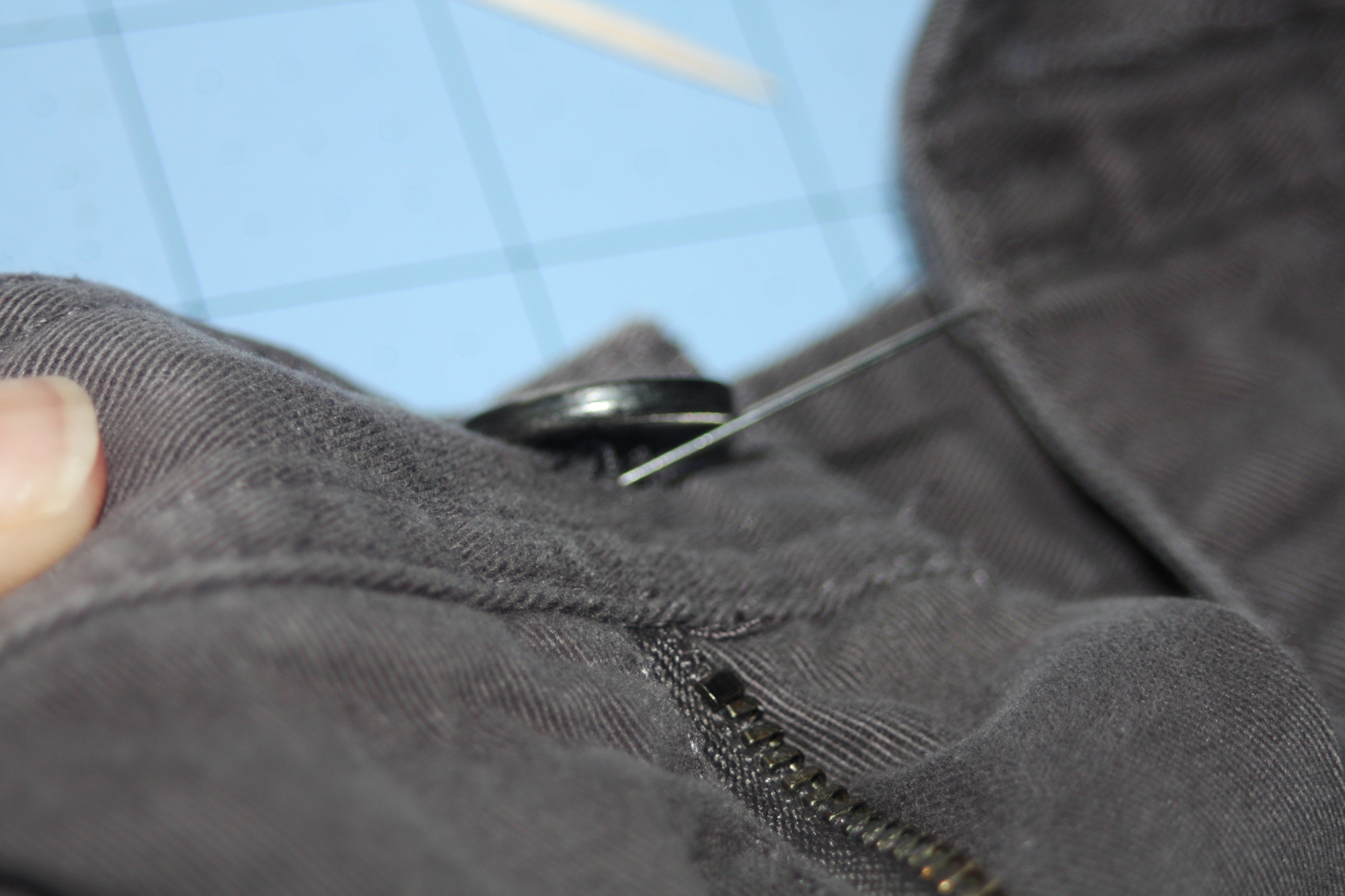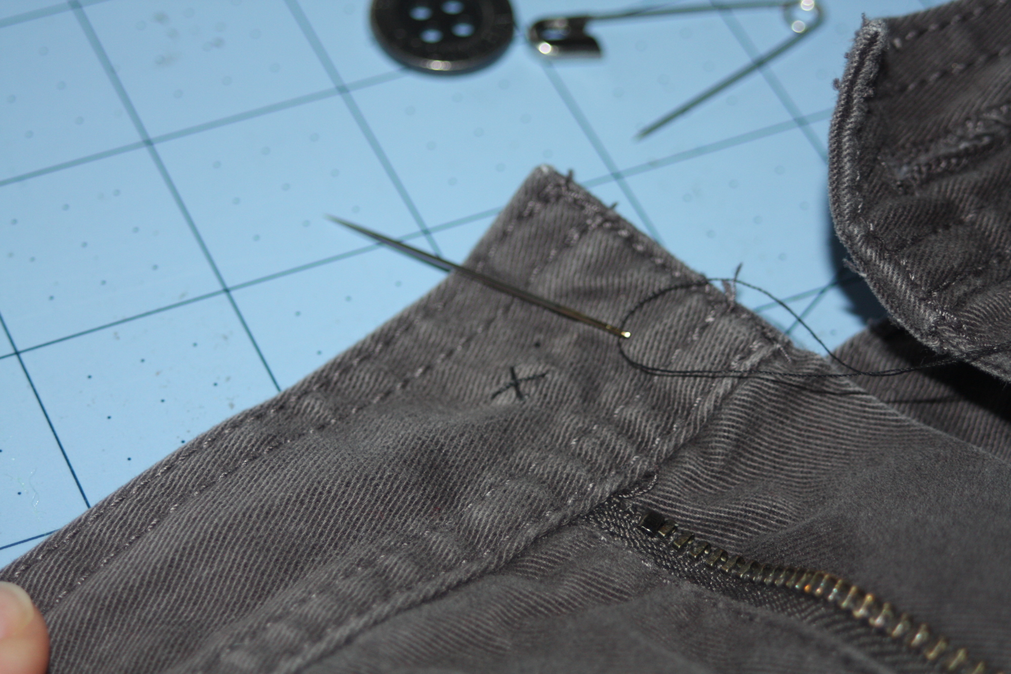Poke the needle in from the inside of the garment and sew an “X” on the spot where you will be sewing the button. This secures your stitches and your button will be less likely to fall off again.