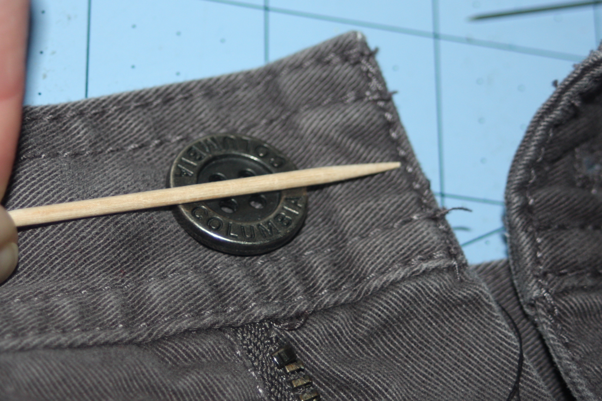Sew the button on, making the stitches over the toothpick as shown. 5-10 stitches should do it.